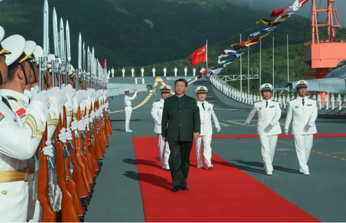 2019年12月17日,中国第一艘国产航空母舰山东舰在海南三亚某军港交付海军。习近平出席交接入列仪式并登舰视察。这是仪式结束后,习近平登上山东舰,检阅仪仗队。新华社记者 李刚 摄