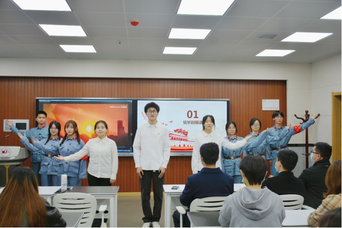 第一个环节是情景剧朗诵——《听》。九位同学以诵读和表演的方式带领师生了解了抗战烽火中的延安新华广播电台,在斗争中它记录了全国军民浴血奋战的英勇事迹,人民广播如号角般唤起人民的斗志,凝聚起中华民族的爱国热情,发挥了枪炮弹药不可替代的特殊作用。节目以一种新颖的方式让同学们听到了老延大的声音,赢得了强烈的共鸣和热烈的掌声!