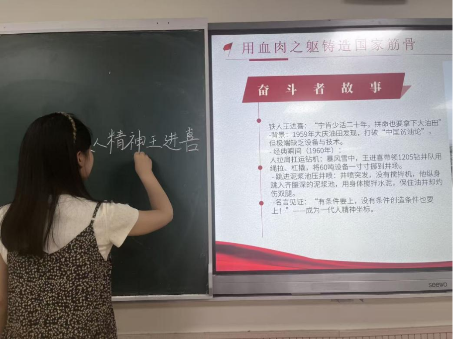 崔馨元则聚焦社会主义革命和建设时期,通过展示“一五计划”老照片对比图,讲述了“铁人王进喜”“红旗渠精神”等感人故事,激励大家发扬艰苦奋斗的精神。
