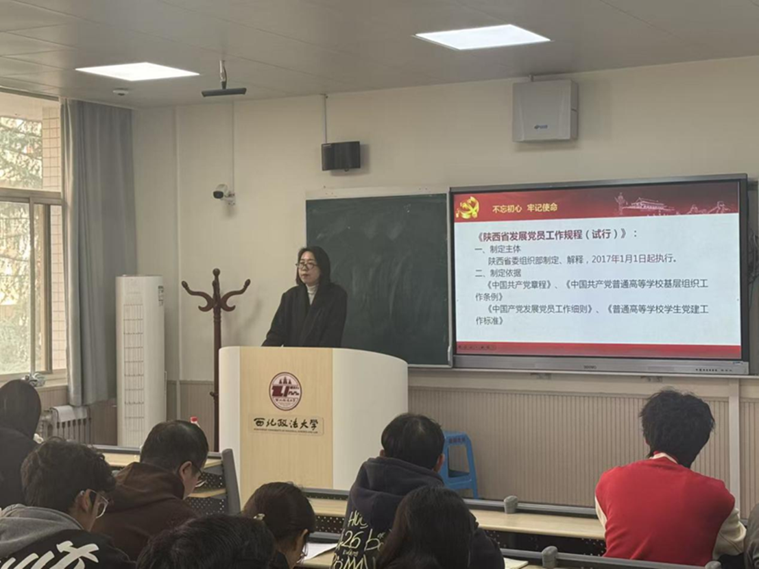 学院党委副书记上官亚敏、学院党委组织员丁磊就“党员的权利与义务、党员发展程序和流程”等内容做详细讲解,帮助入党积极分子深刻领悟“两个确立”的决定性意义,增强“四个意识”、坚定“四个自信”、做到“两个维护”,端正入党动机,确立为共产主义事业奋斗终身的信念。