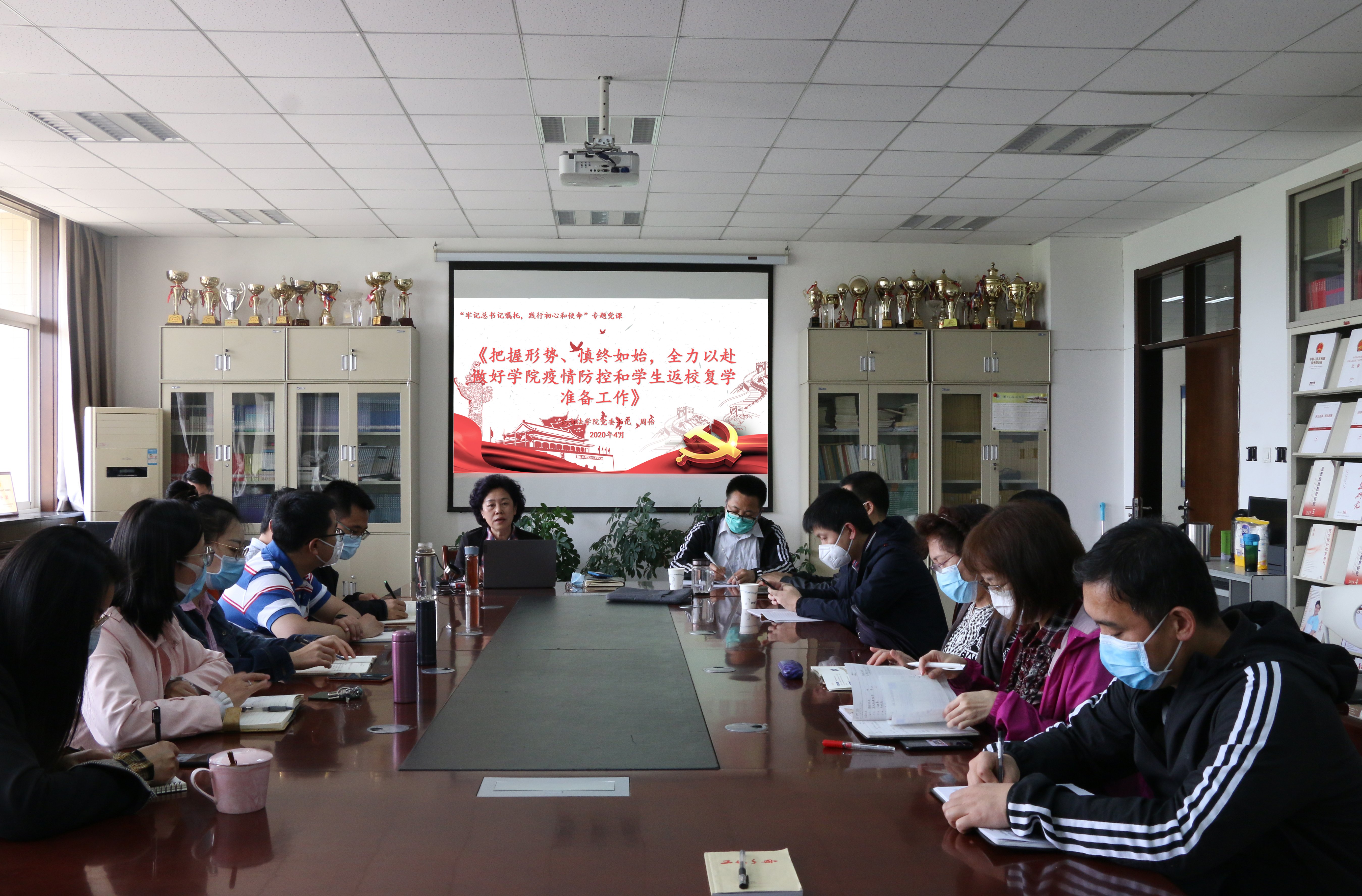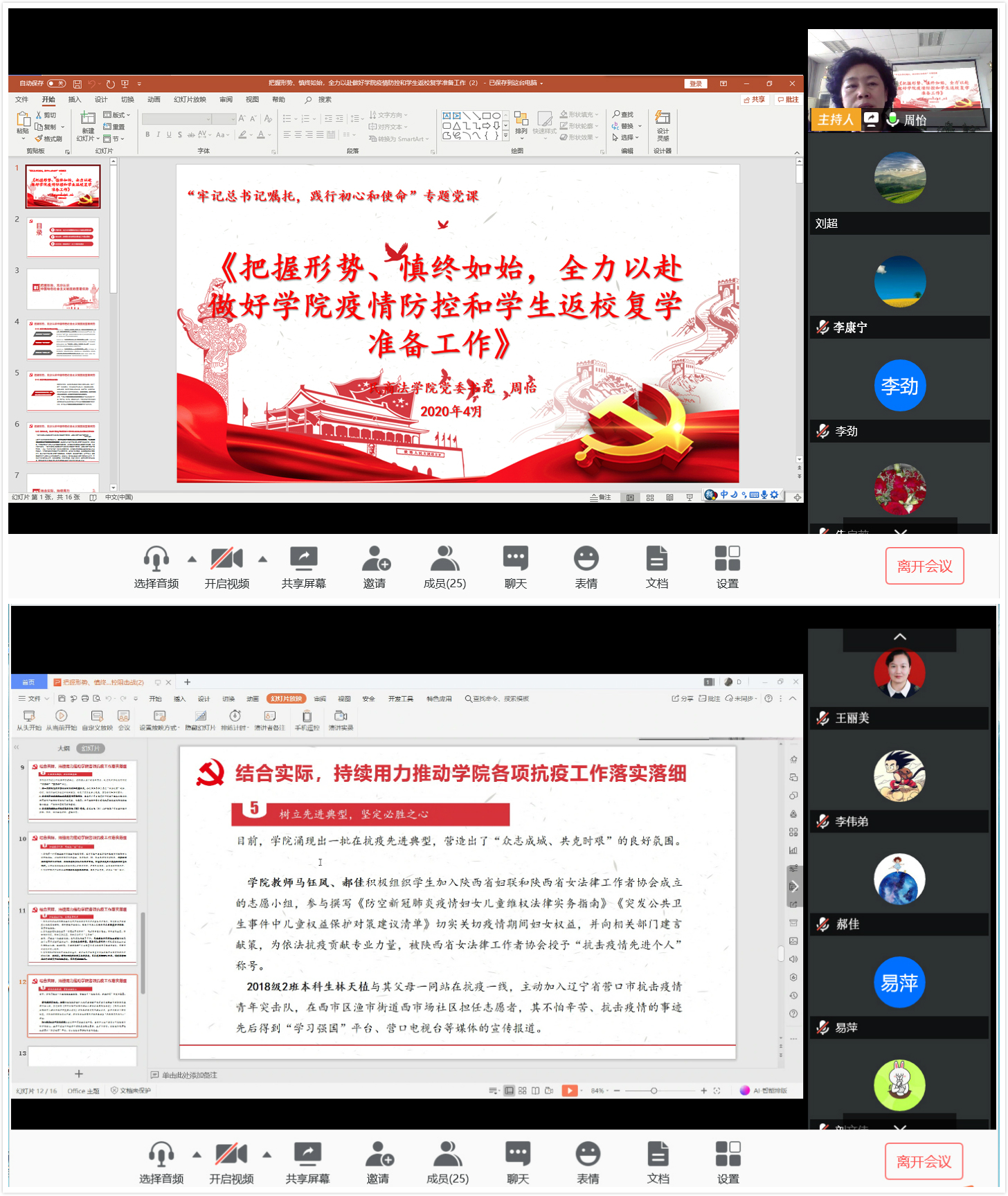 按照校党委《关于讲授专题“云党课”的通知》要求,周怡以《把握形势、慎终如始,全力以赴做好学院疫情防控和学生返校复学准备工作》为题讲授专题“云党课”。她围绕习近平总书记关于疫情防控工作的重要讲话精神和国内外疫情防控形势,结合学院实际工作,从把握形势,充分认识中国特色社会主义制度的显著优势;结合实际,持续用力推动学院各项疫情防控工作落实落细;咬定目标,明确学院下一步工作重点和要求等三个方面进行讲授。周怡指出,当前返校复学工作正在紧锣密鼓的筹备当中,我们一定要一以贯之坚决贯彻省委和校党委决策部署,从严落实疫情防控各项要求,做实、做细、做好学院复学准备工作,明确疫情防控和教育教学两手抓、两不误的工作目标,一是要提高政治站位,把疫情防控工作当做一项重要政治任务来抓,把师生的生命安全和身体健康放在首位,切实履行“守好责任田”的政治责任。二是要提高工作能力,在疫情防控常态化中自觉适应线上“云办公”“云授课”,不断提升工作能力和教学能力。三是要全力落实学校返校与健康管理工作方案,切实应对返校复学中可能出现的风险与挑战。