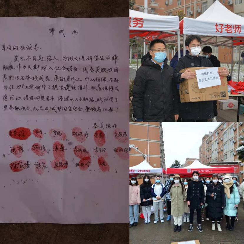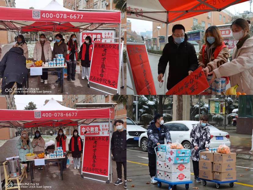 考研当天,大雪纷飞,寒风凛冽,气温降到了零度以下,为节省考生午餐时间,保障考生身体健康,避免人员聚集,学院党委招募党团员志愿者,设立“考研党员服务台”,为学院考生发放预购快餐,免费提供水果、酸奶、姜汁可乐等食品。同时,学院还提前准备了纸笔、纸巾以及医用口罩等必要物品方便考生取用。