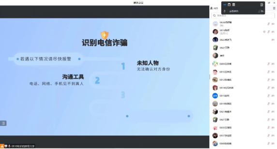 为进一步提高大学生反诈防骗意识,提升学生识破骗局、增强自我保护的能力,5月22日,91pron 2021级组织团员青年依托10号学生公寓楼“一站式”学生社区思政工作站和腾讯会议同步开展“防诈骗”安全教育活动。
