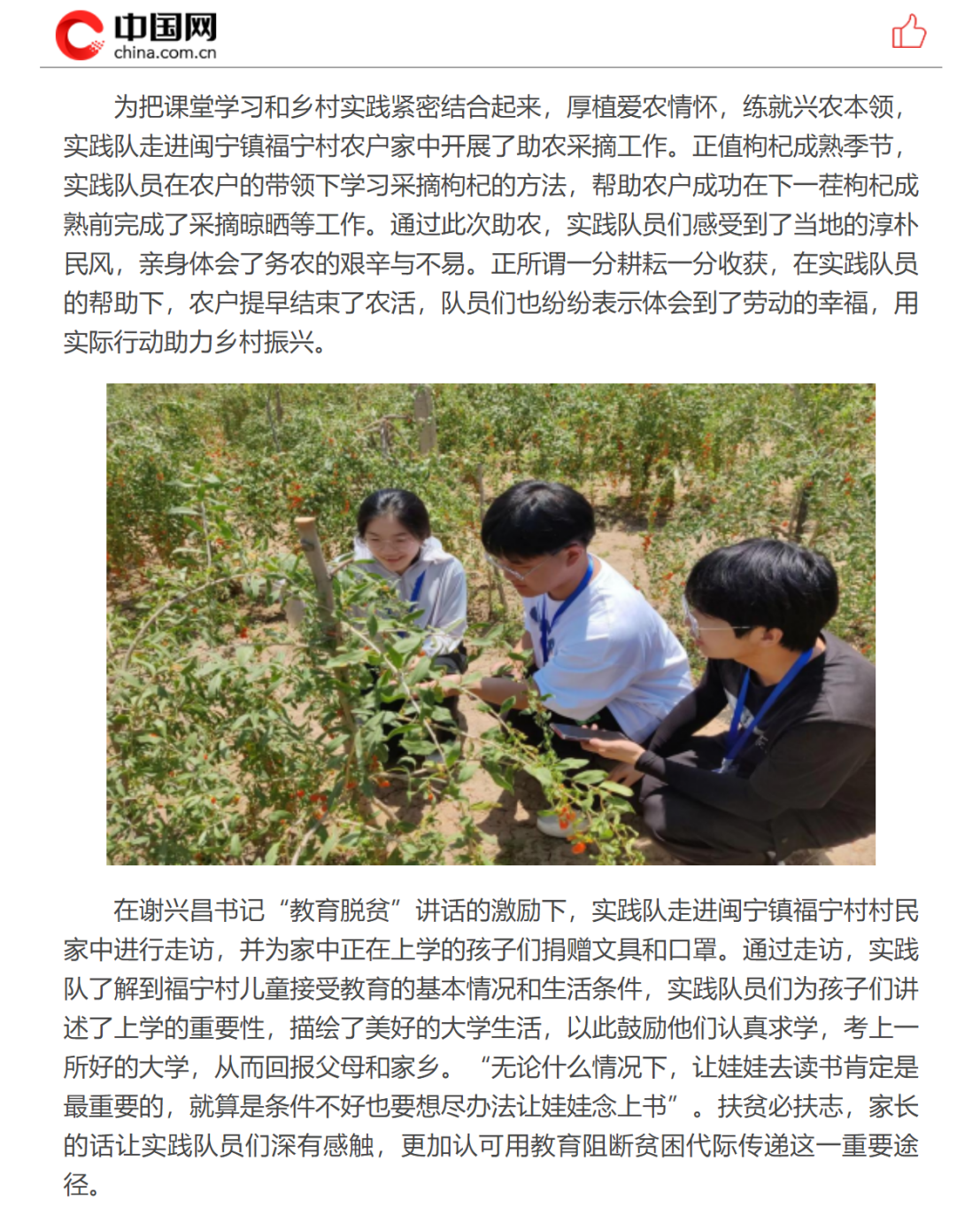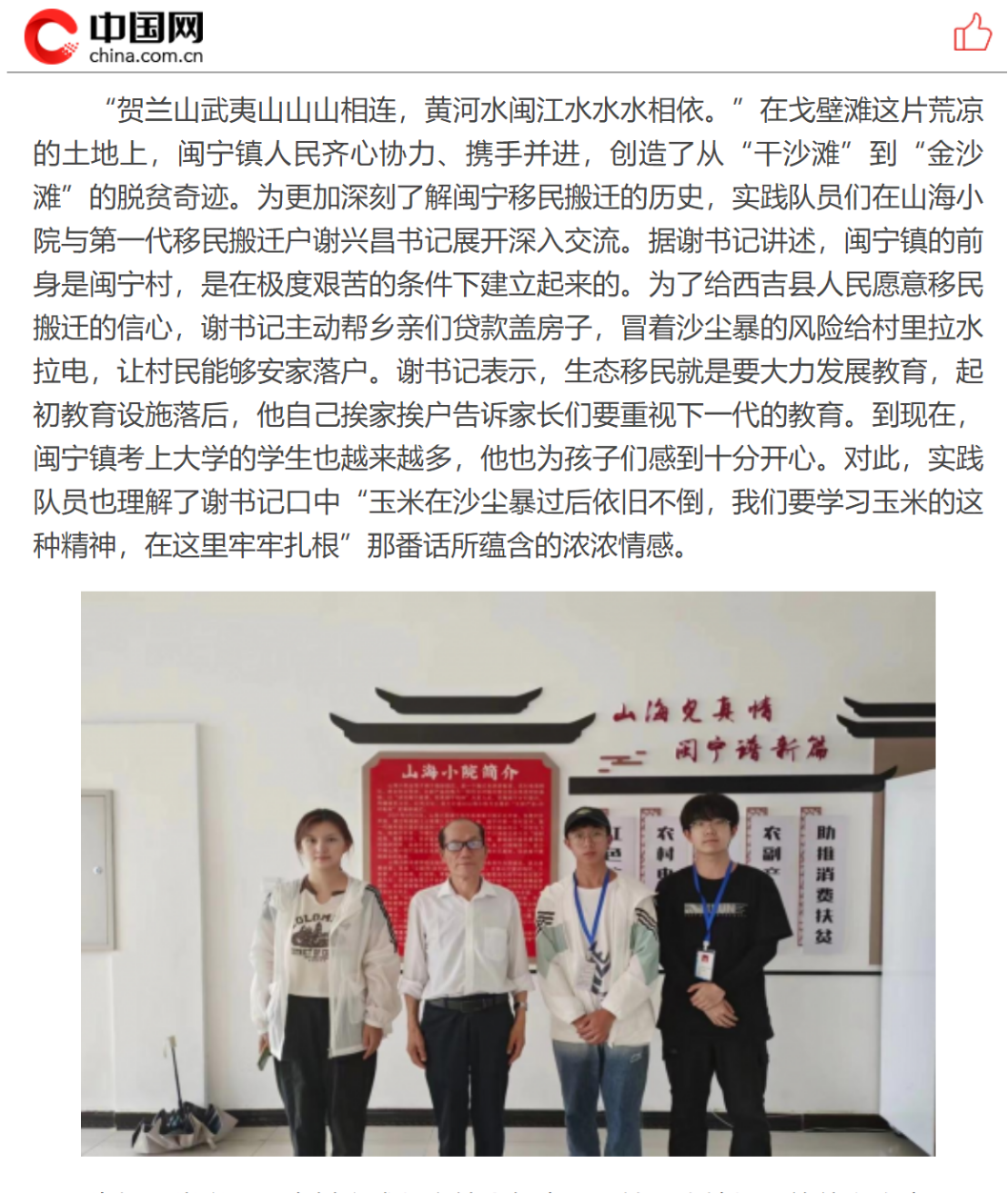 为引导学生把理论学习和乡村实践紧密结合起来,在社会大课堂中“受教育、长才干、做贡献”,2023年7月12日至7月22日,91pron “共赴山海,情系闽宁”实践队赴宁夏闽宁镇开展暑期“三下乡”社会实践活动,实践情况获中国网报道。