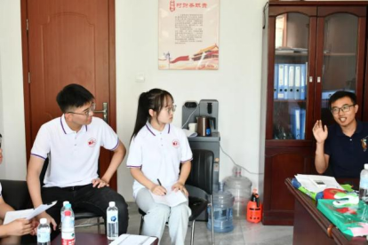 随后,实践队丁艳艳老师、张智超老师同朱从诚书记等相关负责同志就黄鹿泉村建设情况、发展规划开展了座谈交流。据悉,近年来,黄鹿泉村坚持党建引领,坚持生态美、产业兴、百姓富的发展理念,努力打造生态保护、绿色发展示范区,实现了乡村振兴顺利破题。未来,该村将加快三产融合,叠加红色文旅和社区功能。朱从诚书记表示,将进一步让“生态链”变“致富链”,“后进村”变“后劲村”。