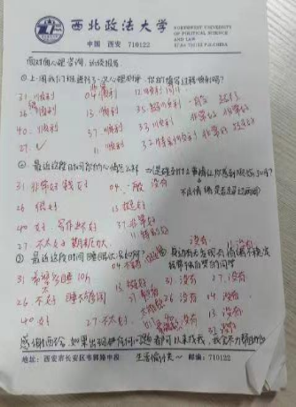 李倩同学通过四个问题“上周心理测评中填写过程是否顺利?”“身边是否会出现情绪不稳定或经常独自哭泣的同学?”“最近的心情怎么样?如果有存在不良情绪,是否超过两周?”以及“最近会不会出现失眠等情况?”心理委员对同学们一一进行了调查询问和记录并开展相应辅导活动。