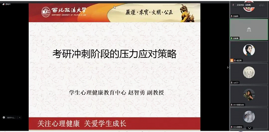 赵智勇副教授围绕考研备考期间的压力成因、潜在心理问题、压力应对策略等方面展开讲解。他指出了备考过程中可能出现的心理问题比如焦虑、失眠、自我怀疑及其产生原因。他强调,面临压力是备考期间的正常现象,同学们应该增强自信心,运用积极的自我暗示,来达到减压增效的效果。对讲座时同学们提出的如何以良好的状态备考的问题,赵智勇副教授指出,同学们要学会利用“上、下、不、动、静”睡眠五字诀,养成规律高效的睡眠习惯,并通过运动调节不良情绪,始终保持信心积极备考。