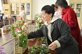 妇女节当天,正是阳光明媚的时候,学院资料室里充满了欢声笑语,老师们在进行趣味横生的插花活动。桌上已经摆好了丰富的花卉材料:相思果、康乃馨、向日葵、玫瑰和满天星……花朵娇嫩欲滴,竞相绽放。她们先是挑选自己心仪的花材,再对选好插好的花朵进行调整和裁剪。她们巧妙地将各种花材搭配在一起,创作出各有特色的花艺作品。