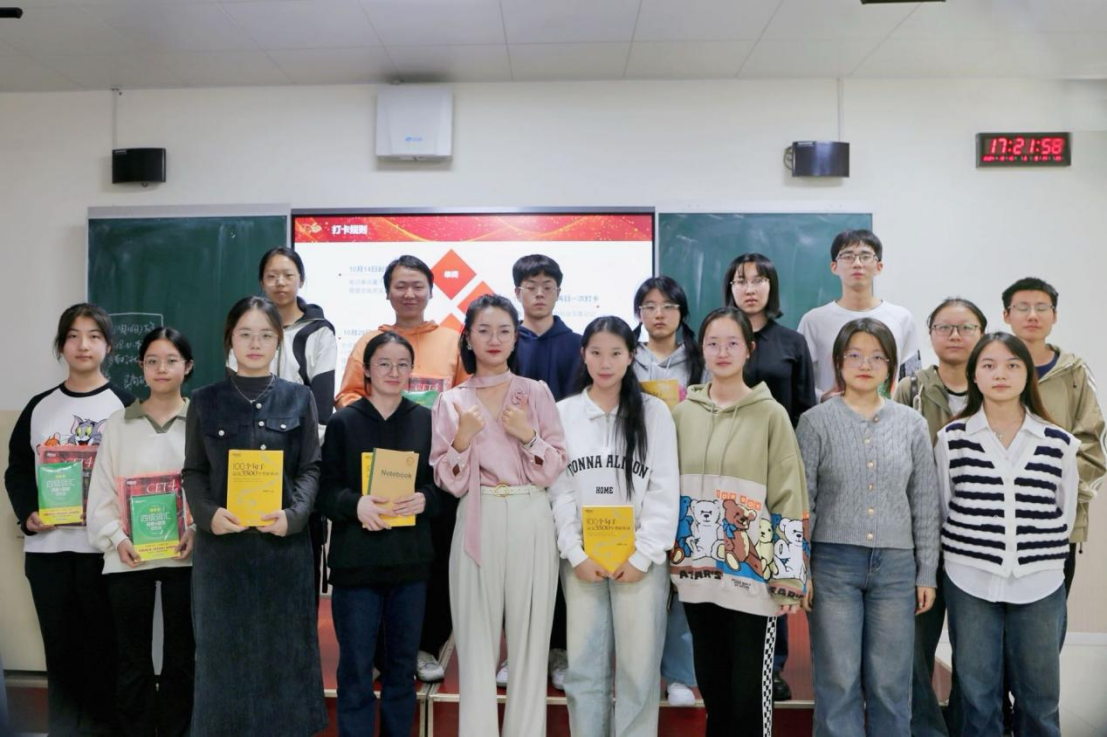 为表彰先进、鼓励进步,树立榜样,进一步营造良好的学习氛围,提升91pron 学生的四六级通过率,10月16日下午16:40,91pron 于三号楼301教室举行“知行”朋辈导师工作坊第一季“21天四六级冲刺”活动表彰会暨第二季启动仪式。“知行”朋辈导师工作坊指导老师、2022级本科生辅导员杨亚男、“知行”朋辈导师工作坊成员、获奖学生代表以及部分活动参与者出席本次活动,朋辈导师赵彤彤主持。