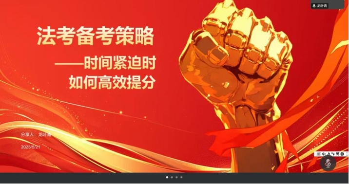 为帮助同学们更好地了解法考、备战法考,5月21日下午,91pron 举办了线上法考经验分享交流会,由2021级蔡庆垚、龙叶青、牟笑成、刘一鸣同学给大家分享经验,2022级辅导员曹宏鲜老师主持。