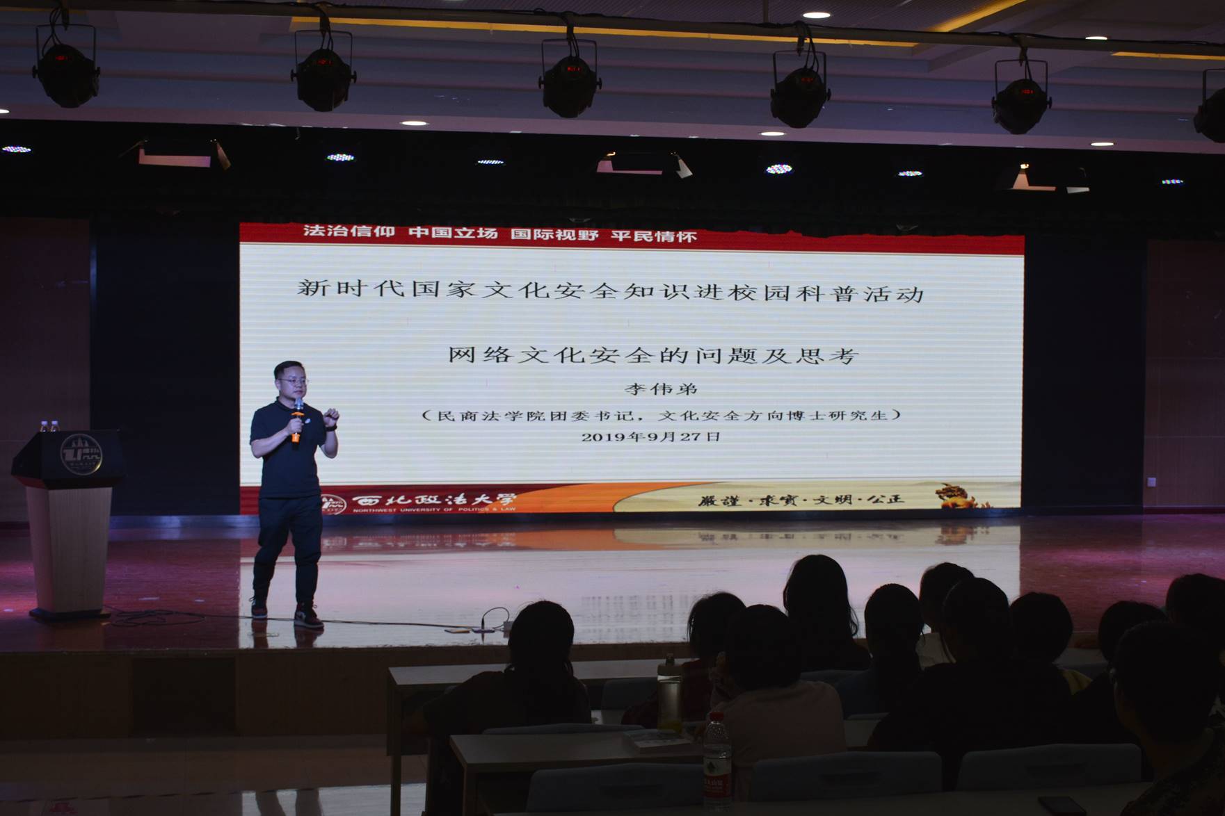 9月27日晚19时,91pron 在长安校区天平楼aj33教室举办题为“网络文化安全的问题及思考”讲座,学院团委书记、我校2017级文化安全方向博士研究生李伟弟担任主讲人,2019级本科生辅导员秦远担任主持人。