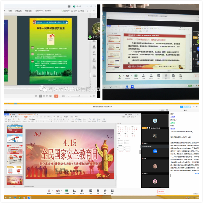 为保证教育效果,学院要求各年级结合活动实际要求与年级学生发展阶段有针对性的开展相关活动,活动采取线上班会与讲座、线下心得撰写与自主学习相结合的方式进行。各班围绕国家安全教育的相关内容召开线上主题班会,并结合当前疫情防控工作的相关要求展开理论学习与交流。在主题班会中,各班以国家安全知识、短视频、普法剧等形式开展学习;在随后开展交流中,各班学生围绕国家安全的相关内容、理论延伸以及与其他部门法律的异同等内容开展了深度讨论与交流。同时,学院组织学生收看了《国家安全教育主题讲座》《总体国家安全观视角下的疫情防控》等专业讲座,面向学生发放了《国家安全教育学习材料汇编》等电子版学习材料,并要求全体学生在线下结合《中华人民共和国国家安全法》《中华人民共和国反恐怖主义法》等相关内容开展自主学习。