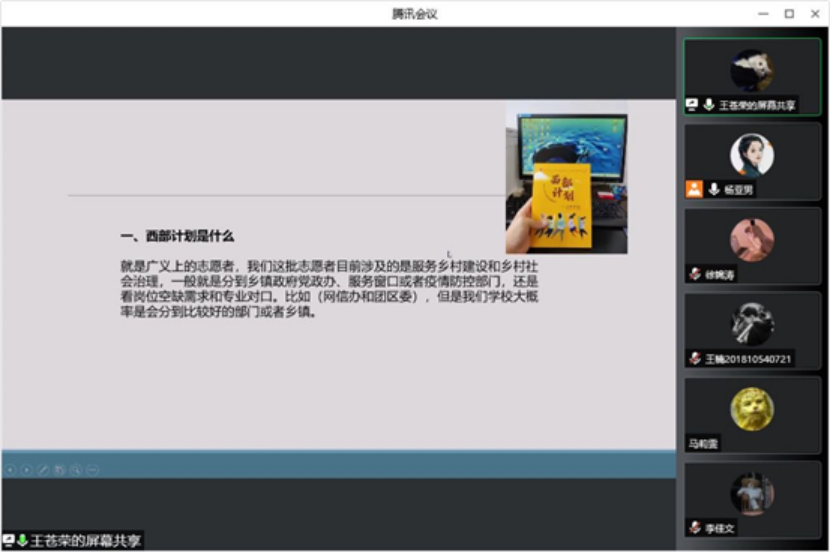 最后,杨亚男老师对此次会议进行了总结。她向会议中的同学们提出了三点期望:一是要认清形势,转变就业观念;二是要明确目标,坚定就业信心;三是要主动出击,把握就业机遇。此次线上经验分享会使同学们对西部计划及求职面试有了更深入的了解,帮助同学们树立了就业信心,拓宽了就业思路,为同学们抓住机会走好就业之路起到了积极作用。