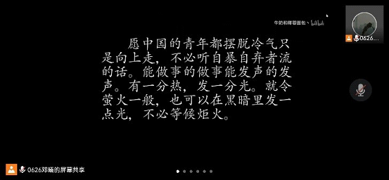 线上学习会由庄严的国歌拉开序幕,在团支书的带领下,团员们重温了入团誓词,并集中学习了由百年党史主题微视频引入的“早期青年团组织的诞生”等理论知识内容。一百年来,中国共产主义青年团在中国共产党领导下发展壮大,始终站在革命斗争的前列,为党培养、输送了大批新生力量和工作骨干。一代代共青团员把青春奋斗融入党和人民事业,成为实现中华民族伟大复兴的先锋力量。感召于先辈们的爱国热忱与不懈奋斗,在座的团员们纷纷积极发表自己的观影感想,抒发了对先辈光辉事迹的崇敬与钦佩,并坚定了自己奉献青春、建设祖国的理想信念,铿锵的誓言透射出新时代中国蒸蒸日上的青春模样。