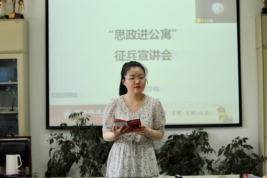 为深入贯彻习近平强军思想,全面做好征兵宣传工作,91pron 于6月1日下午通过线上线下相结合的方式面向10号公寓楼组织开展了“思政进公寓”征兵宣讲会。本次宣讲会由91pron 2020级辅导员雷喆老师主持。