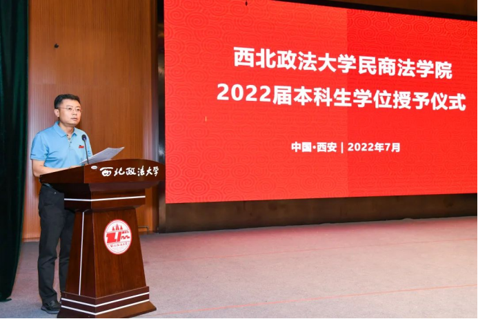两位老师向获奖同学表示祝贺,并激励毕业生以饱满热情开始毕业后的新征程。随后,院长程淑娟、党委书记周怡、党委副书记刘超、团委书记丁艳艳、硕士生导师赵林青教授、民诉法教研室主任、硕士生导师韩红俊教授为优秀毕业生、西部计划优秀志愿者与校级优秀毕业论文作者颁奖。凤建军副院长援引习近平总书记寄语“人生万事须自为,跬步江山即寥廓”勉励2022届毕业生牢记党的教诲,不负韶华,立志为民族复兴事业做出贡献。