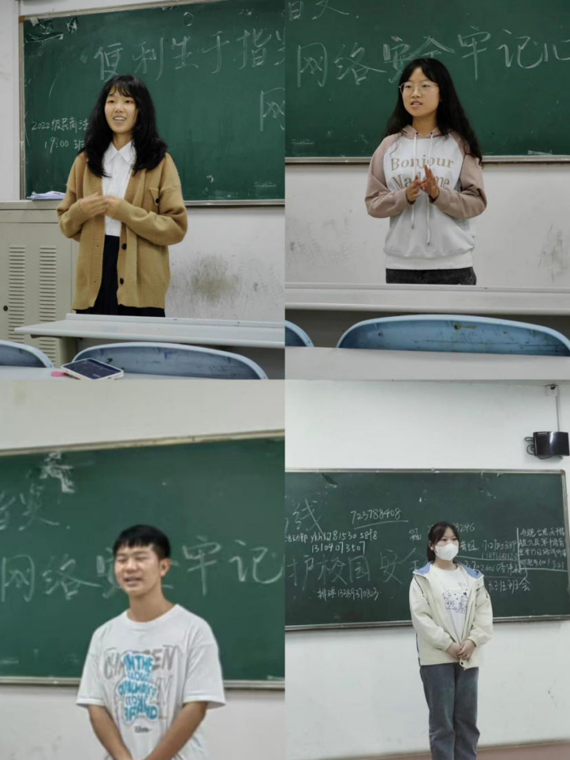 为进一步做好疫情防控常态化下的学生管理工作,教育引导广大新生严格遵守学校疫情防控制度和校园管理规定,积极配合学校做好疫情防控期间各项工作。9月22日下午19时,91pron 2022级各班新生于致知楼3、4层教室分班开展疫情防控安全教育暨新生班委任职主题班会,班会以线上线下相结合的形式进行。2022级辅导员曹宏鲜老师、杨亚男老师主持,2022级全体新生参加会议。
