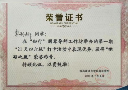 实习实践方面,我曾参与“三下乡”实践活动和资助育人打卡活动,所在团队获“优秀团队”称号,。与此同时,我还曾先后前往米脂县人民法院以及大成(西安)律师事务所实习,并每周在长安区劳动仲裁委值班。实习期间,我虚心学习、勤奋工作,凭借出色的表现荣获“优秀实习生”荣誉。这段经历不仅让我将理论知识与实践紧密结合,更让我对未来的职业发展有了更清晰的认识和规划。
