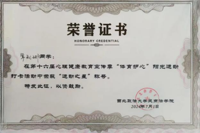 赛场是锤炼能力的熔炉,而国家资助政策延伸的实践扶持、学校搭建的竞赛培育平台,是我敢闯敢拼的坚实后盾。创新创业类竞赛中,依托学院资助的竞赛指导资源与孵化支持,我与团队屡创佳绩,在中国国际大学生创新大赛中多次斩获三等奖、优秀奖;在2024年大学生新文科实践创新大赛校级比赛中夺金,并于2025年成功晋级国赛现场;并于第十五届“三创赛”上获二等奖,在第六届“挑战杯”中大学生课外学术科技作品获优秀奖。其中,学院为参赛团队提供的赛事资料包、专家评审指导、项目打磨场地,均源自资助育人体系的实践赋能,让我们得以精准优化项目方案,夯实实践创新能力;心理健康类竞赛中,结合班级心理委员岗位,学院资助开展的心理健康培训、赛事专项扶持,助力我以专业能力参赛。在学院的帮助下,我获得了“心理健康漫画大赛”三等奖、优秀校园心理剧剧本征集三等奖,与团队摘得第十届校园心理情景剧大赛团体二等奖,个人获评十七届心理健康教育宣传季“心理健康教育工作先进个人”,既守护了同学们的心理健康,也让资助培育的综合素养得以展现;文体类竞赛中,学院依托资助资源打造的文体活动平台,让我实现全面突破:女足领域,学院提供的训练器材、赛事经费补贴,支撑团队斩获女足超级杯团体亚军、女子九人制足球联赛团体季军,我个人获评体育季活动“运动之星”,且连续2年助力团队拿下一二九趣味运动会团体第一名与精神文明奖;军训合唱比赛中,我随队获一等奖,与团队共同参加团体操展演,还获第二十九届校园电子海报设计大赛优秀奖,全方位展现综合素养,让资助赋予的成长动能转化为赛场佳绩。