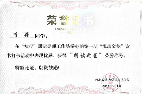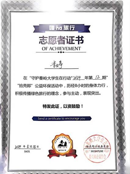 感恩在心,责任在行。个人的成长与国家的发展紧密相连。国家在我们最需要帮助的时候伸出援手,为我们青年一代的成长铺路。这份国家资助与学校援助,让我感受到了肩上的责任与使命。在社会实践方面,我积极参与2023-2024暑期参加西安市法律援助中心的培训;2024-2025寒假在陕西省云德律师事务所参与实习;2025-2026暑假在西安市雁塔区人民法院参与集中实习,获“优秀实习生”荣誉称号,并长期在长安区劳动仲裁委进行值班学习;在公益服务活动方面,总公益服务次数达上百余次,参与刘洋老师用心组织地“法途职引活动”、保护秦岭公益活动、心理剧协助志愿活动等等,并获得2024518日“守护秦岭”公益活动志愿者证书。在公益活动中,我们寻找到自我价值所在,体验到帮助他人带来的喜悦与收获。