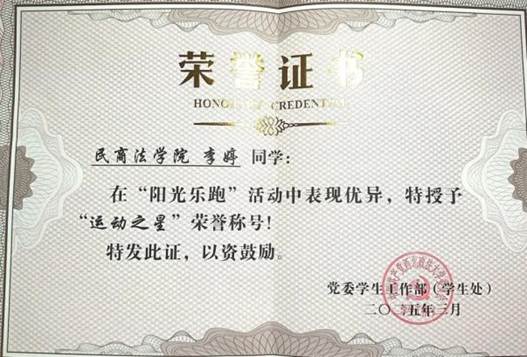 尘雾之微,补益山海;荧烛末光,增辉日月。我担任班级班干部、院学生会宣传部志愿者;班级综测排名第2名,年级综测排名第7名;注册有个人的公众号账号“生与斯长于斯”,发表个人的读书感悟与实践思考,以及对社会热点的看法与认识。并获得91pron 第十三届大学生读书打卡优秀证书。同时,我积极参与校园文化建设,获得校园马拉松第 11 名的名次、高校跑团联盟比赛团体第4名的好成绩、获得校园阳光乐跑运动之星荣誉称号、心理季主题活动获得二等奖等,努力为校园文化建设贡献个人力量。