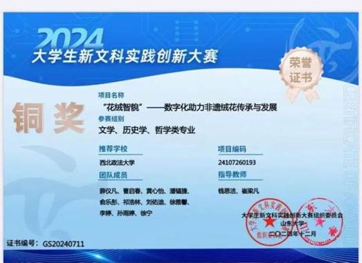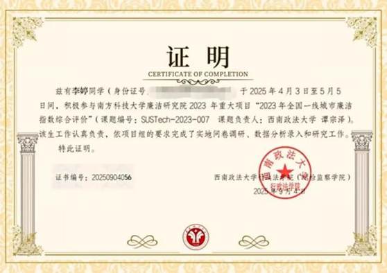 有一份热,发一份光。青年努力奉献,让奋斗洪流汇聚在新时代,让有为之花绽放在新时代。在科研实践方面,我积极参与20242025年新文科大赛,并获得校级金奖、国家级铜奖、优秀奖项;在2025挑战杯比赛中获得省级三等奖;2025年大学生AI赋能挑战赛省级三等奖;十五届全国大学生“三创赛”挑战赛校级一等奖;第一届人工智能大赛校级三等奖;西南政法大学与南方科技大学廉洁研究所全国一线城市廉洁指数综合评价课题项目优秀证书。