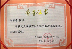 我始终以高标准严格要求自己,在思想上积极追求进步,牢记“法治信仰,中国立场,国际视野,平民情怀”校训,主动参与马克思主义学院举办的“党史观教育融入高校思政课教学展示活动”,并获得三等奖。认真学习党的创新理论,在班级“红色经典诵读”“党史学习分享会”等活动中感悟初心使命,不断筑牢信仰之基,获得入党积极分子培训机会,用坚定的理想信念指引前行方向。