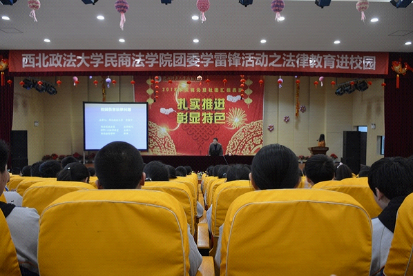 2018年3月9日下午,91pron 团委组织学生会在陕西师范大学万科中学开展学雷锋活动,此次学雷锋活动以法律教育为主题,万科中学副校长刘波、德育处主任上官林、团委书记陈亚茹、八年级全体班主任及学生,91pron 副教授李康宁、学院辅导员李伟弟、刘超等四百余人参加了此次活动。