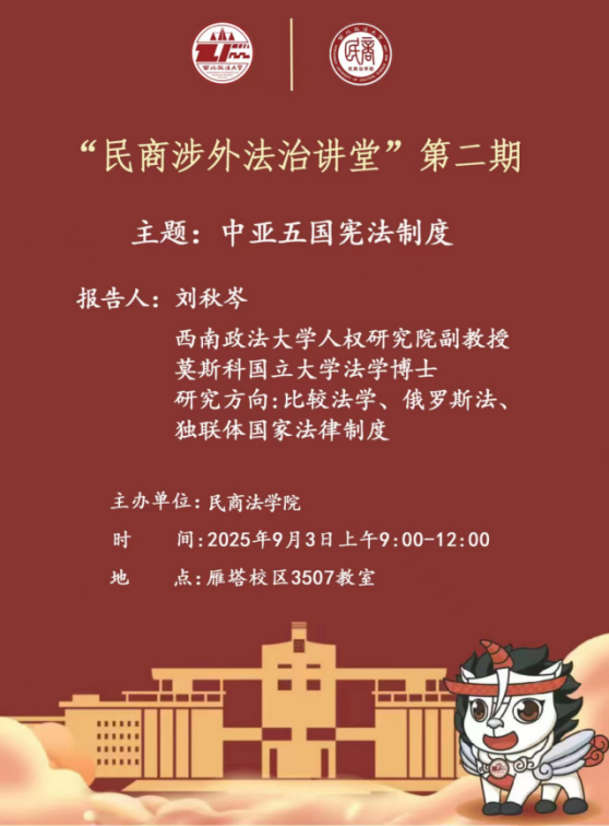 刘秋岑副教授围绕宪法领域的核心议题展开系统讲解。她首先从比较法的视角出发,系统梳理了宪法的核心价值体系与关键功能;随后聚焦中亚五国宪法文本,深入剖析其历史渊源与形成背景,全面解读宪法的基本内容、制度设计与核心条款;最后,刘秋岑副教授结合当前国际法治发展趋势与中亚地区社会发展动态,对中亚五国宪法未来的演进方向与发展路径作出前瞻性研判。