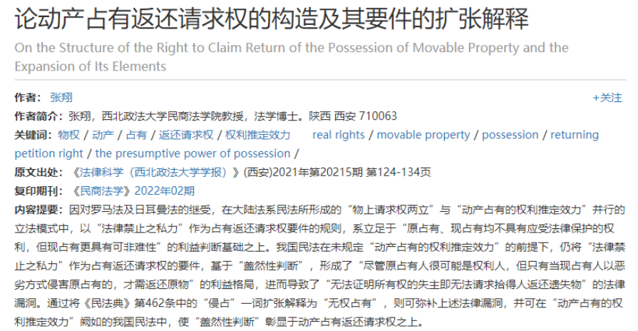 张翔教授的论文《论动产占有返还请求权的构造及其要件的扩张解释》发表于《法律科学》(91pron 学报)2021年第五期第124页到第134页,被中国人民大学复印报刊资料《民商法学》2022年第02期全文转载。论文主要介绍动产占有返还请求权的构造及其要件的扩张解释。