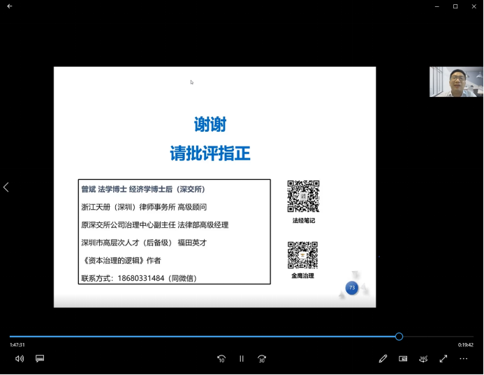 首先,主持人程淑娟院长为大家介绍了主讲人曾斌,曾博士现为浙江天册(深圳)律师事务所高级顾问。兼任深圳国际仲裁院仲裁员,南开大学中国公司治理研究院研究员、深圳市公司治理研究会顾问。曾参与《证券法》《上市公司治理准则》修订工作,在国内外核心期刊发表论文四十余篇,著有《资本治理的逻辑》。