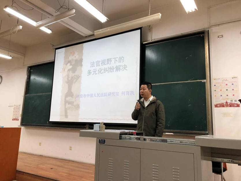 何育凯法官运用详细的案件数量和法官人数数据对法院运行的情况进行了分析,使同学们更深刻地了解到司法实践中诉讼的运行状况,对诉讼外纠纷解决方式的必要性有了更深刻的认识。讲座持续了两个多小时,在同学们的热烈掌声中圆满结束。