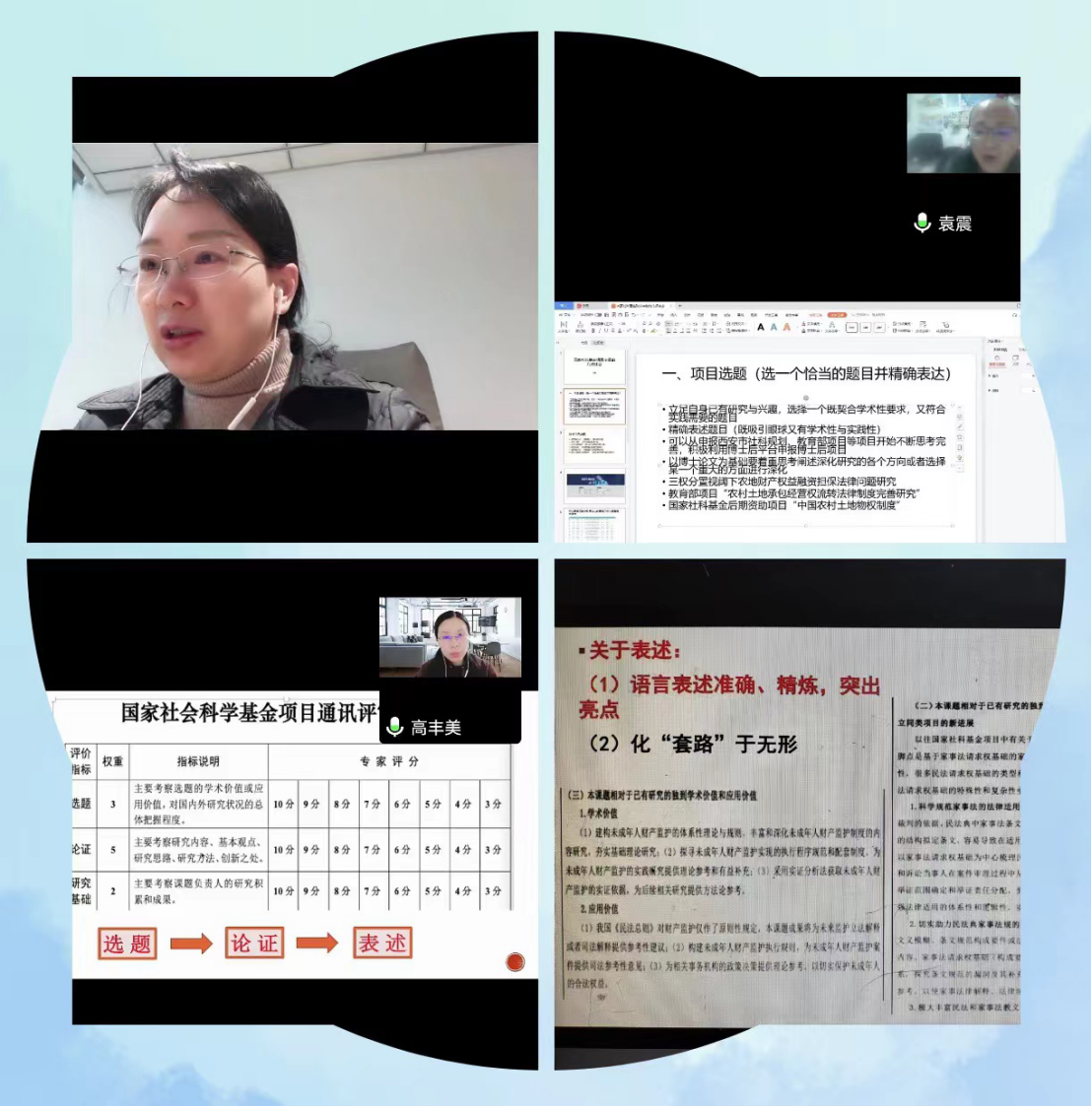 11月9日下午16:30,由校科研处和91pron 共同主办的国社基金项目辅导讲座顺利举行。学院邀请袁震教授和高丰美博士为青年教师作了题为《国家社科基金项目申报的几点体会》的专题辅导,校内外师生百余人通过线上方式参加。程淑娟院长为讲座致辞,百晓锋副院长主持讲座。