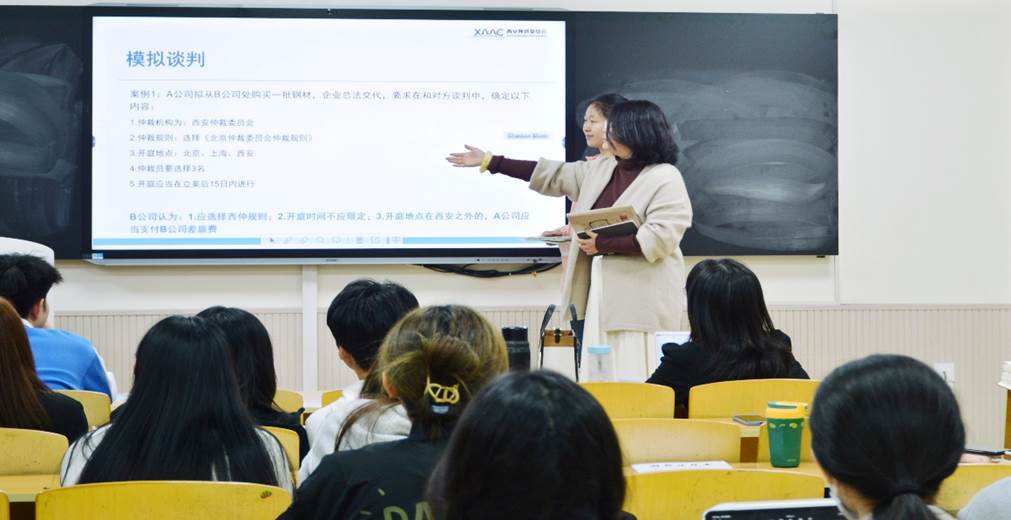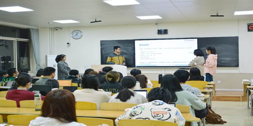 为增强讲座的趣味性和实践性,刘红主任还邀请了四位同学为大家现场模拟了一场商业谈判。四位同学分成两组分别代表两家公司,就仲裁机构、开庭时间、仲裁地点提出了各自诉求,双方你来我往,互不相让。整场谈判精彩纷呈、高潮迭现,不仅活跃了讲座气氛,也进一步点燃了大家的学习热情。韩红俊教授和刘红主任在接下来的点评中先是对这场模拟谈判给予了高度肯定,随后总结了大家的认识误区,指出仲裁规定是以双方约定为准以及商务谈判中一般只有代理律师出席,并为大家示范了谈判的正确顺序。