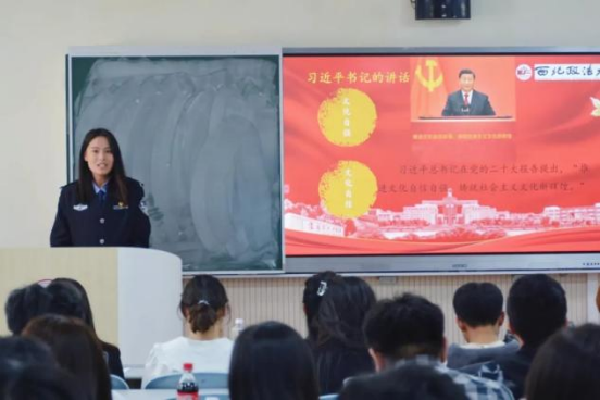 公安学院宣讲人姚朵朵通过分享自己西安延安等地见闻中切身感受到的中华优秀传统文化革命文化出了文化自信这一中心话题经由民族自豪感的深切感召呼吁青年学子坚定文化自信自觉做中华优秀传统文化的传承者和弘扬者赓续中华文脉书写时代强音
