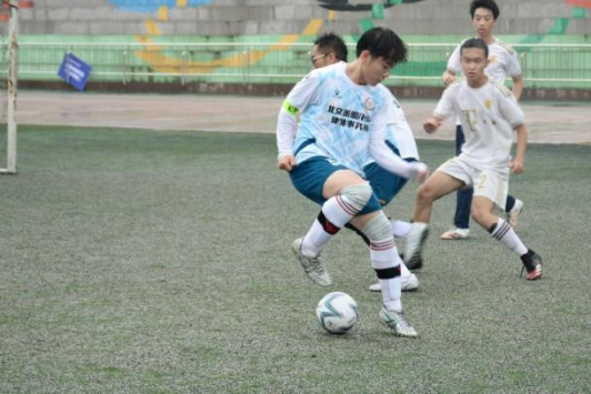 赛前我方球员积极备战,活动热身,队员互相加油打气。随着比赛开场,我方球员迅速进入状态,带球奔跑,身姿敏健。队员之间传球果断,交叉换位,精准拦截对方攻球。9号球员胡真瑞接连两个头球阻断对方进攻,极大地鼓舞了我方士气。随后9号球员胡真瑞与1号球员黄信杰配合默契,交替传接球,成功带球突破对方防线。9号球员胡真瑞突出重围,一记射门顺利进球得分,赢得场边观众欢呼喝彩。上半场比赛结束时,双方比分为1:1。