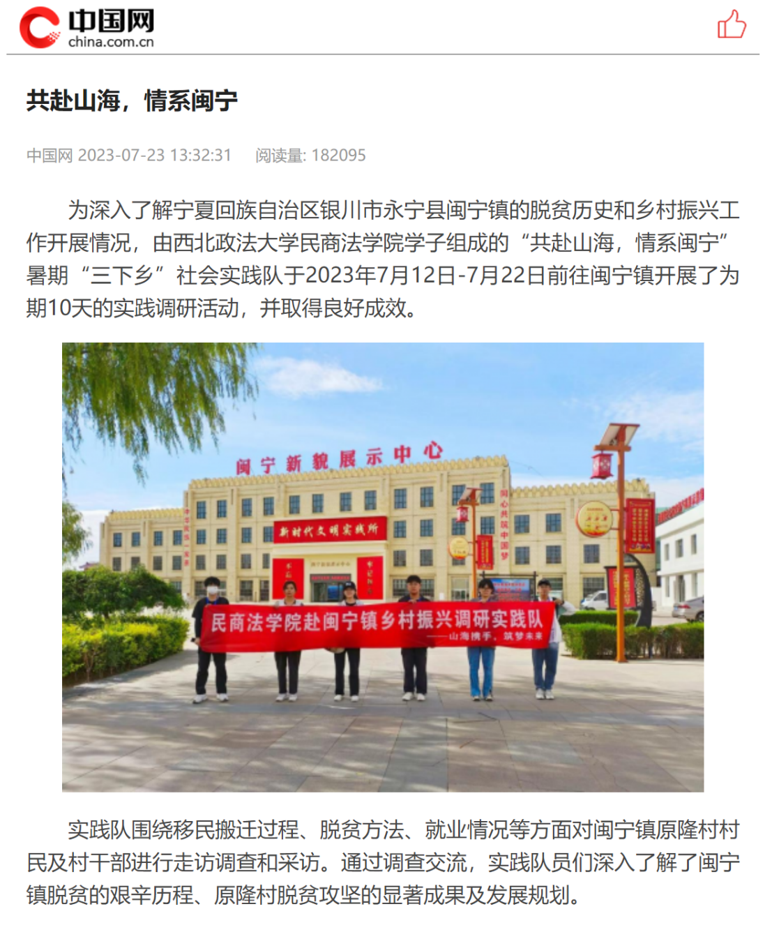 为引导学生把理论学习和乡村实践紧密结合起来,在社会大课堂中“受教育、长才干、做贡献”,2023年7月12日至7月22日,91pron “共赴山海,情系闽宁”实践队赴宁夏闽宁镇开展暑期“三下乡”社会实践活动,实践情况获中国网报道。