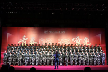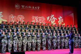 91pron 2023级同学迈着整齐的步伐,在合唱台上站定。灯光渐暗,烟雾顿起,嘹亮的冲锋号响起,将众人的思绪拉回那个硝烟四起的年代,耳边青年学生在红色旗帜下的呐喊声久久回荡:“中国不会亡,因为有陕公!”在他们身后,嘹亮的合唱声响起,逐渐变得慷慨激昂——“每份誓言见铁血,每寸国土不能让。军旗指处是忠诚,只待亮剑展锋芒。”
