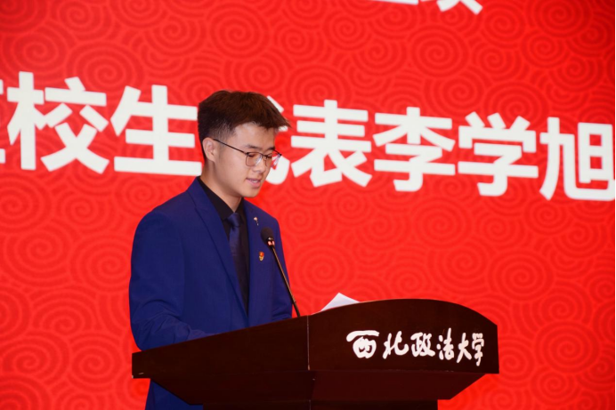 在校生代表李学旭同学在发言中分享了自身的学习生活经验并为新同学介绍了如何更好地开启大学生活。首先,他指出同学们要时刻保持一颗温暖而敏锐的心,真诚对待每一个人。其次,他希望同学们做一个有行动力的人,确立明确的目标并为之奋斗。最后,他倡导同学们勇于展现自身的责任与担当,做一个有使命感和正义感的西法大人。