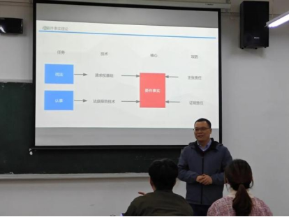 在此基础上,肖军律师向同学们展示了法庭报告技术审查程式表,总结了法庭报告技术的三大特点,即程序先于实体、法律先于事实、原告先于被告。同时,肖律师还强调了要件事实理论,即无论是在“找法”还是“认事”的过程中,要件事实都是最为核心的板块,不可忽视。