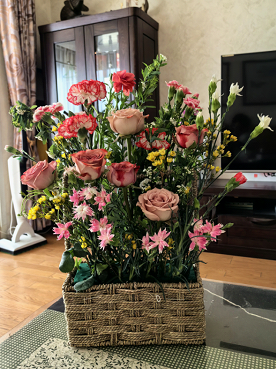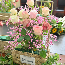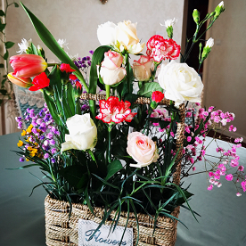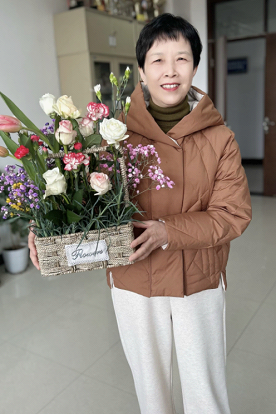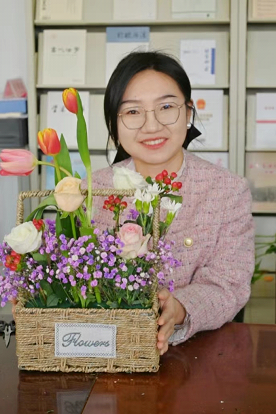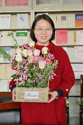 妇女节当天,正是阳光明媚的时候,学院资料室里充满了欢声笑语,老师们在进行趣味横生的插花活动。桌上已经摆好了丰富的花卉材料:相思果、康乃馨、向日葵、玫瑰和满天星……花朵娇嫩欲滴,竞相绽放。她们先是挑选自己心仪的花材,再对选好插好的花朵进行调整和裁剪。她们巧妙地将各种花材搭配在一起,创作出各有特色的花艺作品。