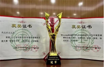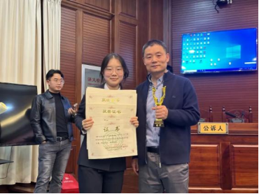在决赛阶段,王泽骧、卢雅茹同学出场担任庭辩队员,在小组循环赛、四分之一决赛、半决赛中,面对紧密的赛程与不同赛题的思维转变,他们沉着冷静、稳定发挥,成功晋级总决赛,与郑州大学代表队展开激烈交锋,最终荣获本届赛事冠军。