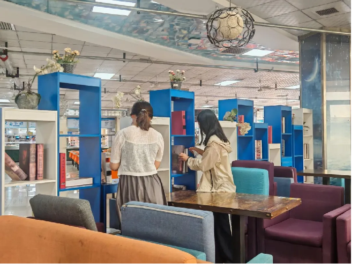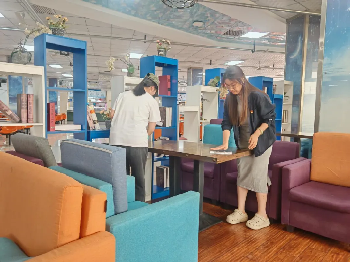 负责餐厅三楼图书角清扫的党员们仔细擦拭着书架的每一层隔板和边缘,相互配合有序分工。不多时,原本略显陈旧的图书角干净如新,营造出和谐整洁的阅读氛围。