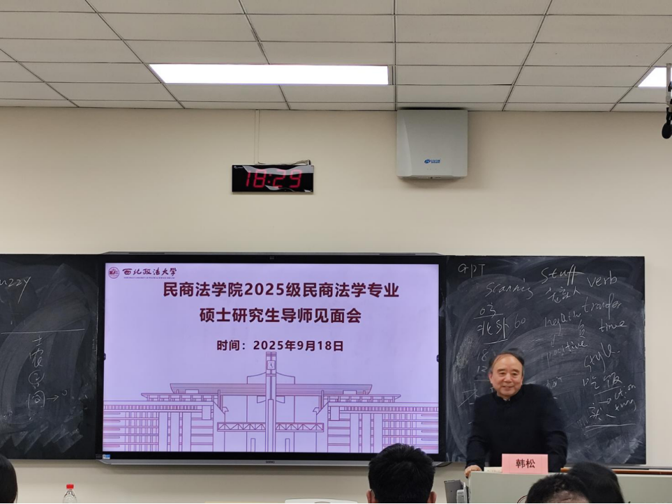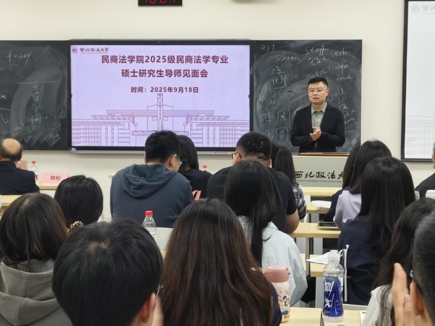 9月18日下午,91pron 2025级民商法学专业硕士研究生导师见面会在三号教学楼3606教室顺利召开。校内研究生导师韩松教授、郭富青教授、 凤建军副教授、王丽美副教授、朱启莉副教授、刘卫锋副教授、国瀚文副教授、党海娟博士、贾同乐博士等以及2025级民商法学专业全体研究生参与了此次见面会。本次会议由91pron 的教学副院长凤建军老师主持!