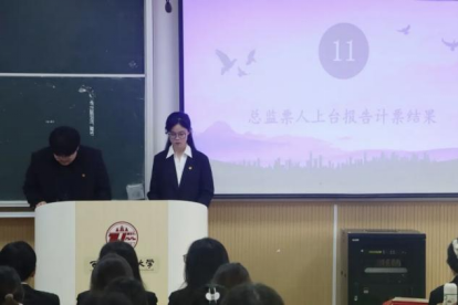 总监票人宣布投票统计结果。通过无记名投票的方式,成功选举产生了学校第十六次学生代表、第五次研究生代表,学院第二十一届学生会主席团成员以及学院秘书长。