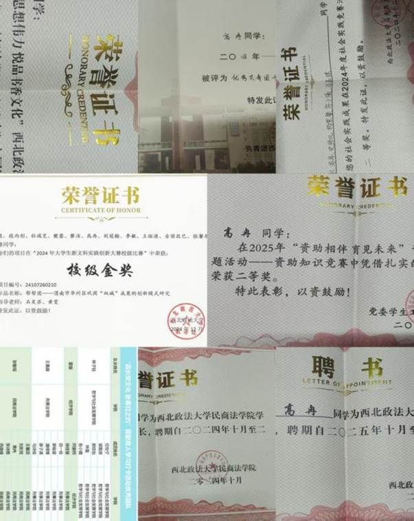 作为班级的生活委员,宣传落实好国家和学校的资助政策是我的一项重要职责,我始终都会以认真负责的态度履职尽责。在贫困认定及国家助学金评选期间,我结合自身申请经历和竞赛积累的资助政策知识,耐心解答同学们对于申请条件、申请程序、材料提交、评议流程等方面的疑问,全力保障评选工作公平公正地有序推进。在日常工作中,我主动配合班级其他班委开展班级事务,秉持“哪里需要就到哪里”的原则,积极补位补台,既成为老师的得力助手,也努力做好同学们的贴心伙伴,为班级建设筑牢保障。作为学院学生会成员,我同样恪尽职守、严格履责。我严格按照团委老师要求,合理统筹部门工作,协助筹备开展了准律师大赛、迎新晚会等学院大型活动。凭借在学生工作中的扎实表现,我在“2024-2025学年91pron ‘五四’表彰”中荣获“优秀共青团干部”称号。