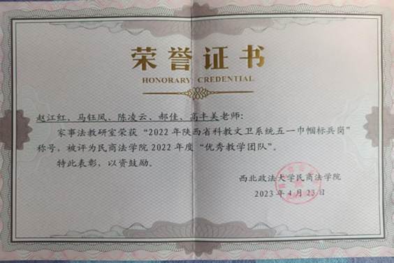 家事法教研室党支部依托学院家事法教研室组建成立,是学院首个师生共建型党支部。2018年,支部被评为陕西省巾帼英雄集体;2022年,家事法教研室荣获陕西省教科文卫系统五一巾帼标兵岗荣誉称号;2022年、2023年,被评为优秀党支部。2022年,支部党员教师陈凌云获得91pron 青年教学名师称号;2024年,支部党员教师郝佳荣获西安市三八红旗手称号。近年来,支部党员教师主持并完成国家社科基金4项,获得省部级教学科研奖6项,发表核心期刊论文20余篇,指导学生参加全国各级竞赛获奖10余项。