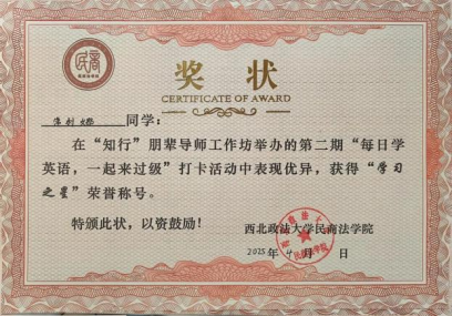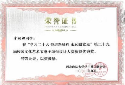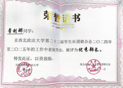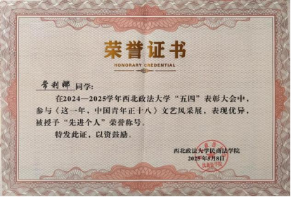 实习实践方面,我曾参与“三下乡”实践活动和资助育人打卡活动,所在团队获“优秀团队”称号,。与此同时,我还曾先后前往米脂县人民法院以及大成(西安)律师事务所实习,并每周在长安区劳动仲裁委值班。实习期间,我虚心学习、勤奋工作,凭借出色的表现荣获“优秀实习生”荣誉。这段经历不仅让我将理论知识与实践紧密结合,更让我对未来的职业发展有了更清晰的认识和规划。