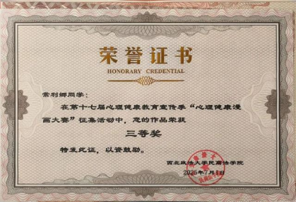 赛场是锤炼能力的熔炉,而国家资助政策延伸的实践扶持、学校搭建的竞赛培育平台,是我敢闯敢拼的坚实后盾。创新创业类竞赛中,依托学院资助的竞赛指导资源与孵化支持,我与团队屡创佳绩,在中国国际大学生创新大赛中多次斩获三等奖、优秀奖;在2024年大学生新文科实践创新大赛校级比赛中夺金,并于2025年成功晋级国赛现场;并于第十五届“三创赛”上获二等奖,在第六届“挑战杯”中大学生课外学术科技作品获优秀奖。其中,学院为参赛团队提供的赛事资料包、专家评审指导、项目打磨场地,均源自资助育人体系的实践赋能,让我们得以精准优化项目方案,夯实实践创新能力;心理健康类竞赛中,结合班级心理委员岗位,学院资助开展的心理健康培训、赛事专项扶持,助力我以专业能力参赛。在学院的帮助下,我获得了“心理健康漫画大赛”三等奖、优秀校园心理剧剧本征集三等奖,与团队摘得第十届校园心理情景剧大赛团体二等奖,个人获评十七届心理健康教育宣传季“心理健康教育工作先进个人”,既守护了同学们的心理健康,也让资助培育的综合素养得以展现;文体类竞赛中,学院依托资助资源打造的文体活动平台,让我实现全面突破:女足领域,学院提供的训练器材、赛事经费补贴,支撑团队斩获女足超级杯团体亚军、女子九人制足球联赛团体季军,我个人获评体育季活动“运动之星”,且连续2年助力团队拿下一二九趣味运动会团体第一名与精神文明奖;军训合唱比赛中,我随队获一等奖,与团队共同参加团体操展演,还获第二十九届校园电子海报设计大赛优秀奖,全方位展现综合素养,让资助赋予的成长动能转化为赛场佳绩。