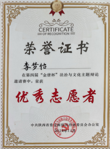 感恩于心,履责于行。国家与学校的资助不仅为成长之路保驾护航,更让我深刻体会到青年一代肩负的责任与使命。在实践中锤炼本领,在服务中践行初心,成为我不变的追求。 实习期间,我于2025年7月-8月在西安市灞桥区人民法院参与实习,期间参与庭审记录、拟写法律文书、整理案卷材料,累计记录案件相关表格9份,拟写法律文书20余份,以严谨认真的态度赢得实习单位高度认可,成功入选优秀实习生推荐名单。此外,我有幸参与诊所法院值班,将课堂所学转化为实践能力,在直面群众法律需求的过程中,深化了对法律职业的认知与坚守。 公益路上,我始终步履不停。在第四届“金唐杯”法治与文化主题辩论邀请赛中获评优秀志愿者,用实际行动传递法治温度。在奉献中收获成长,在担当中共筑温情。